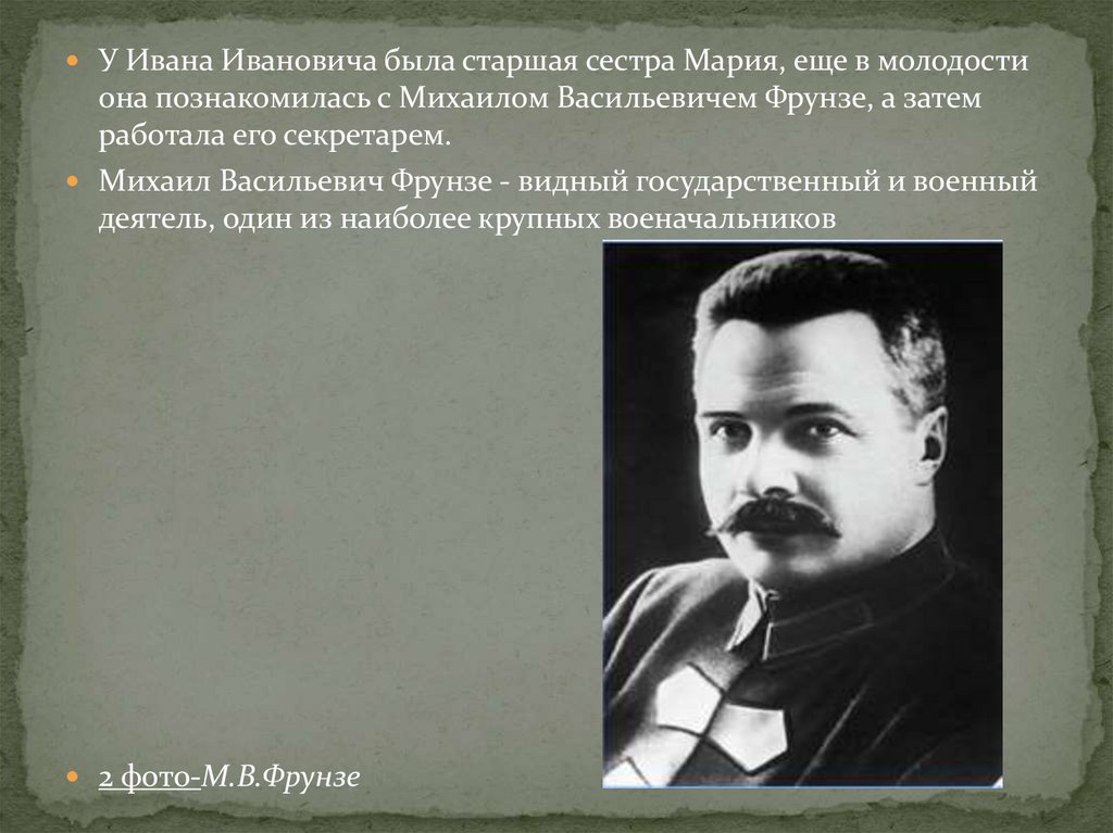У Ивана Ивановича была старшая сестра Мария, еще в молодостиона познакомилась с Михаилом Васильевичем Фрунзе, а затем