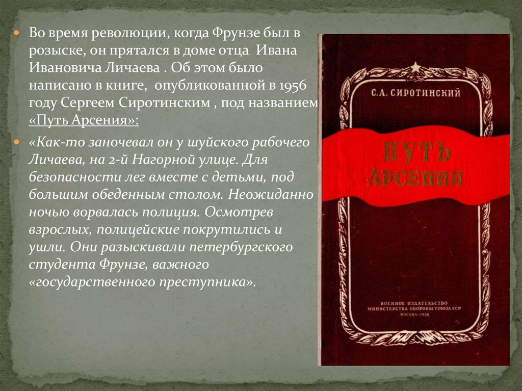 Во время революции, когда Фрунзе был врозыске, он прятался в доме отца Ивана