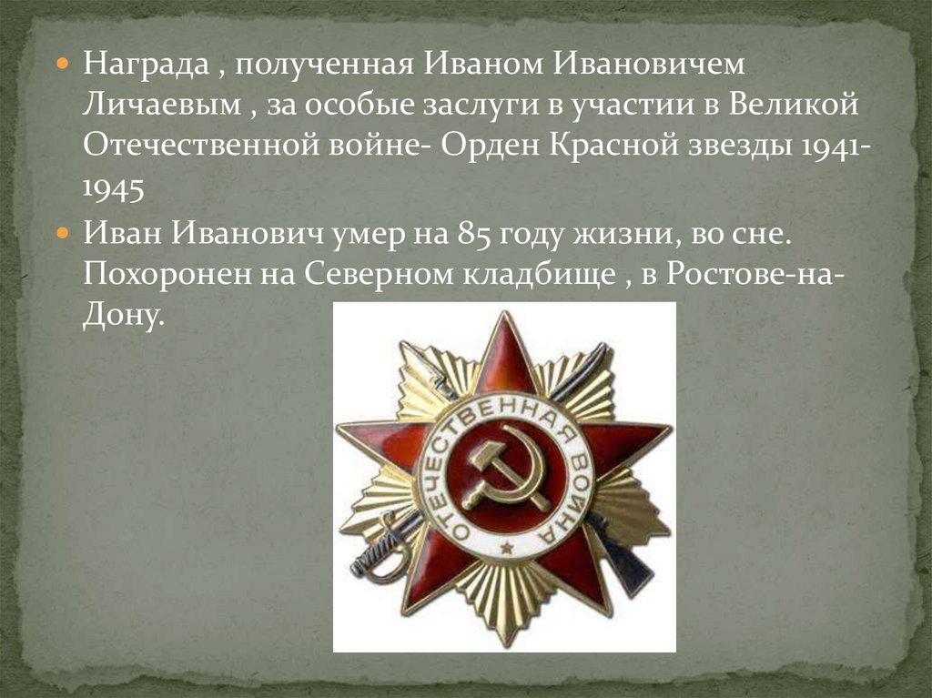 Награда , полученная Иваном ИвановичемЛичаевым , за особые заслуги в участии в Великой