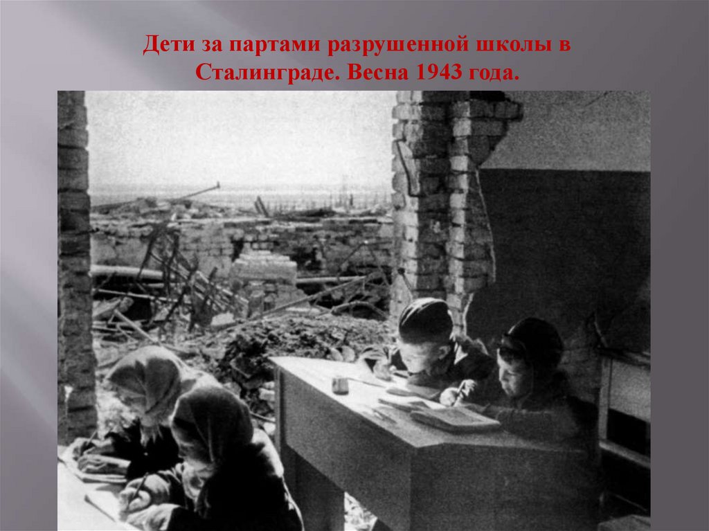 Дети за партами разрушенной школы вСталинграде. Весна 1943 года.