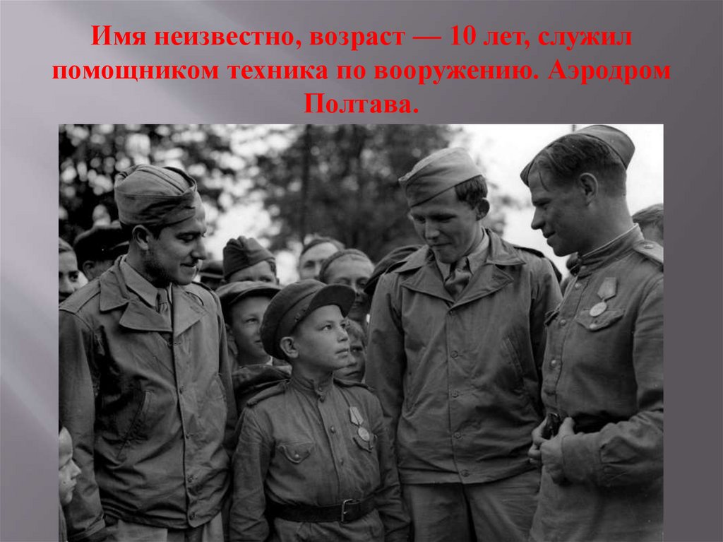Имя неизвестно, возраст — 10 лет, служилпомощником техника по вооружению. Аэродром