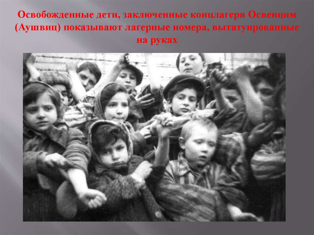 Освобожденные дети, заключенные концлагеря Освенцим(Аушвиц) показывают лагерные номера, вытатуированные