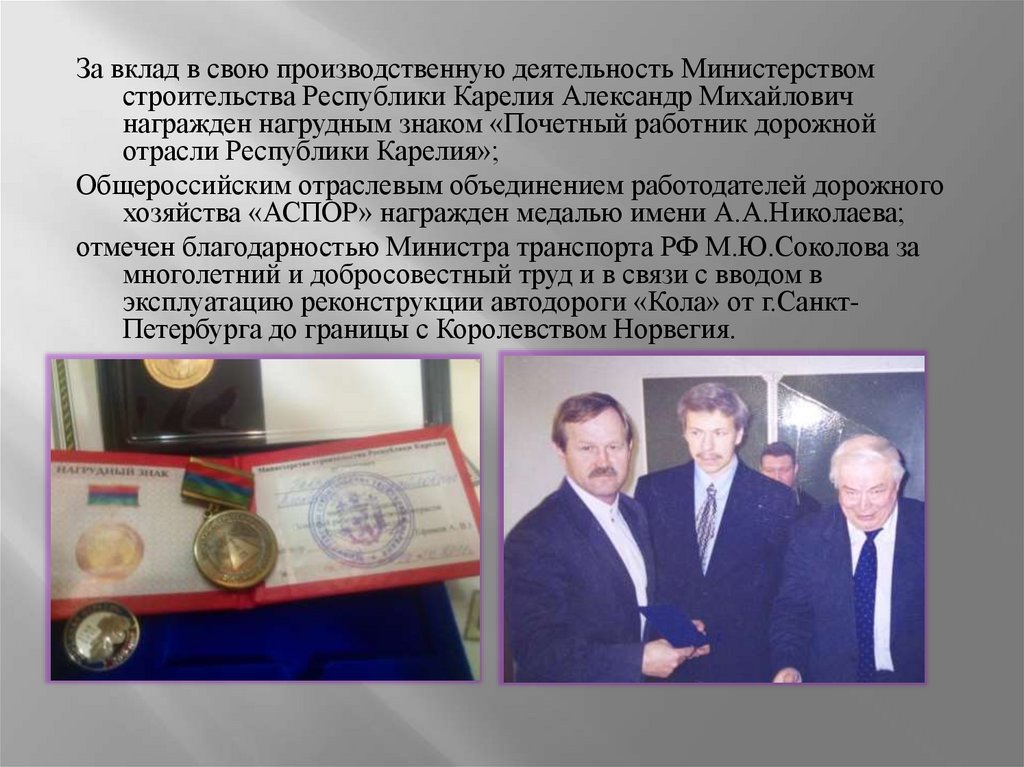 За вклад в свою производственную деятельность Министерствомстроительства Республики Карелия Александр Михайлович