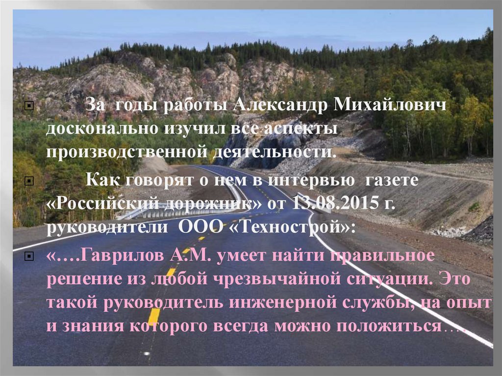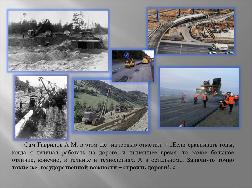 Сам Гаврилов А.М. в этом же интервью отметил: «…Если сравнивать годы,когда я начинал работать на дороге, и нынешнее время, то самое большое