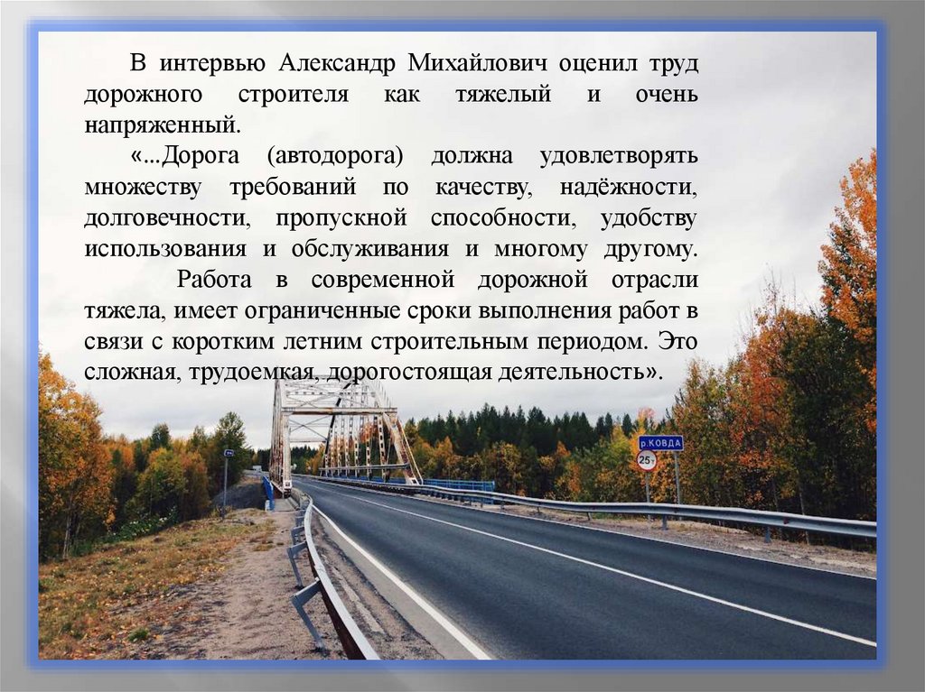 В интервью Александр Михайлович оценил труддорожного строителя как тяжелый и очень