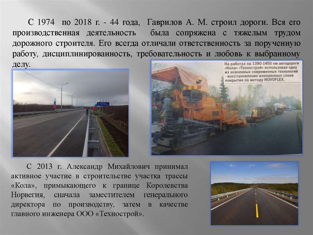 С 1974 по 2018 г. - 44 года, Гаврилов А. М. строил дороги. Вся егопроизводственная деятельность