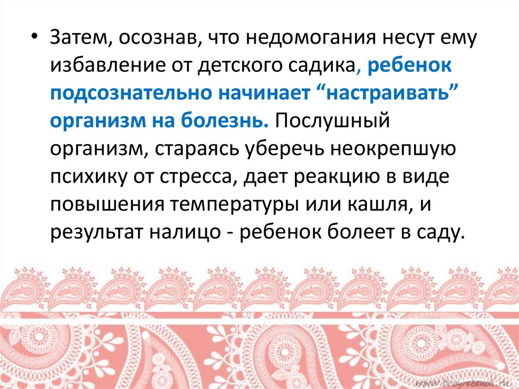 • Затем, осознав, что недомогания несут емуизбавление от детского садика, ребенок