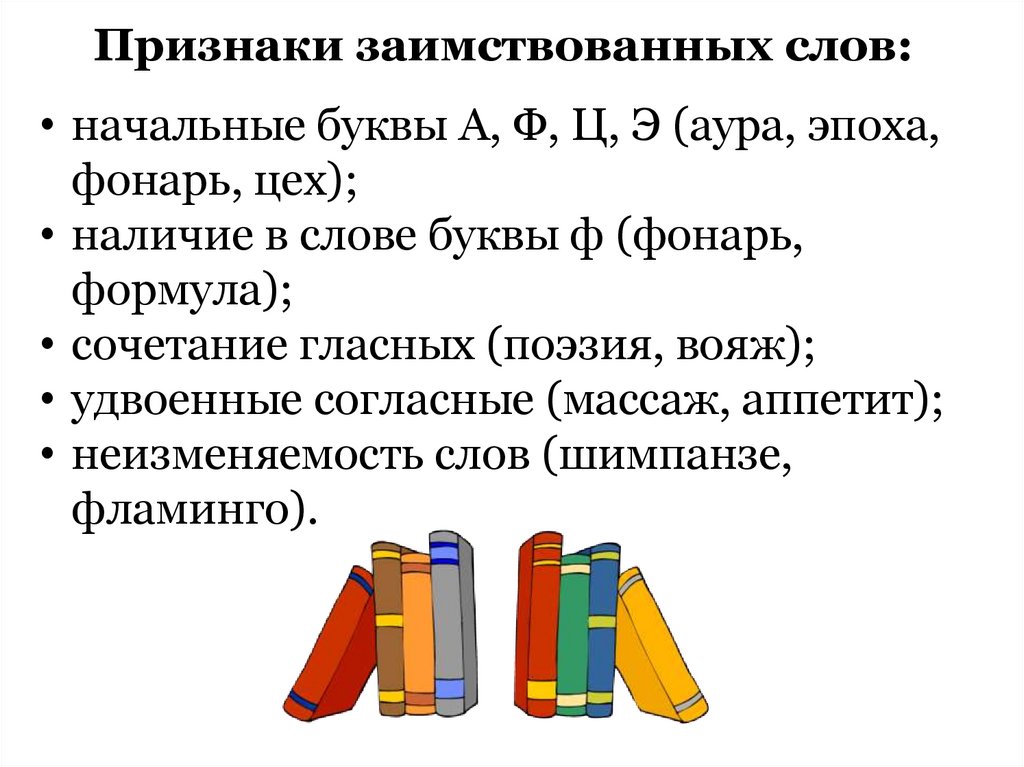Признаки заимствованных слов:• начальные буквы А, Ф, Ц, Э (аура, эпоха,
