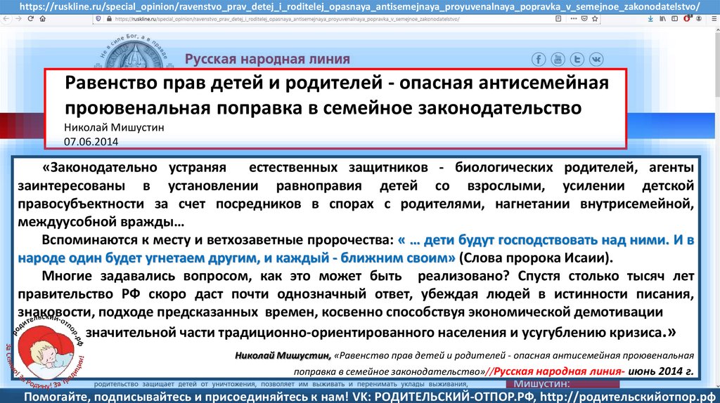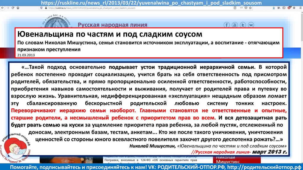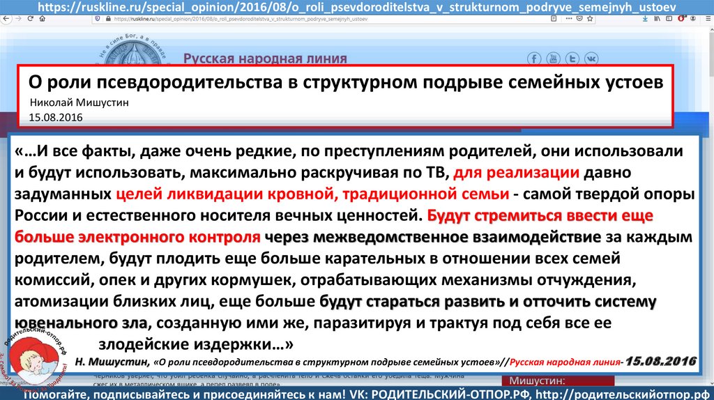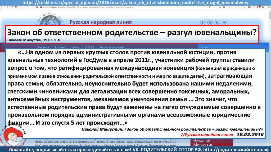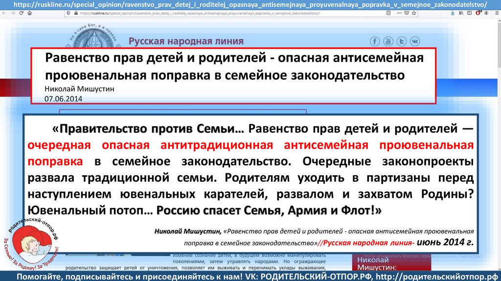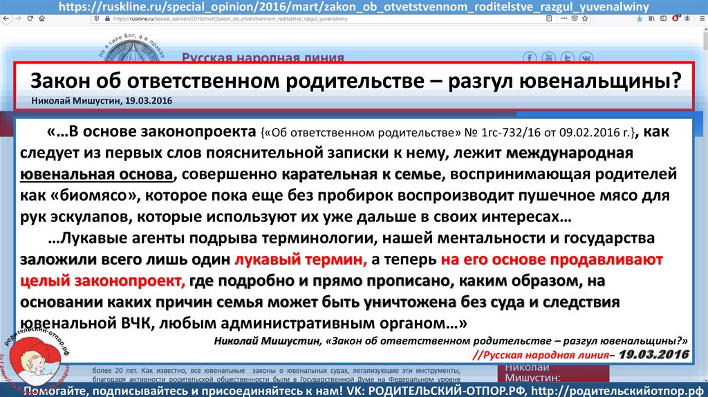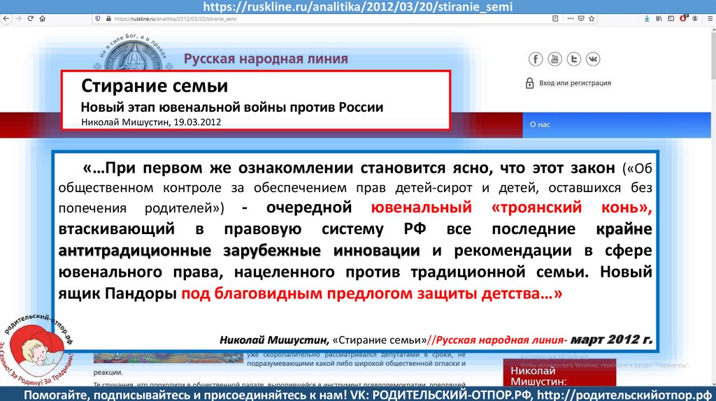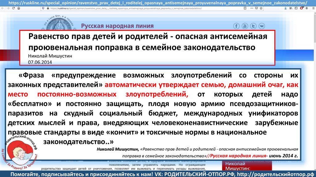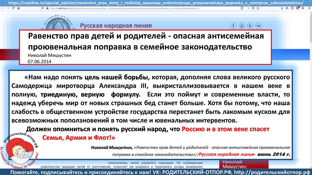 Мишустин Н.Н., «Нет уголовному преследованию родителей за воспитание!»//Русская народная линия -21.01.2020