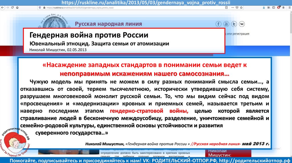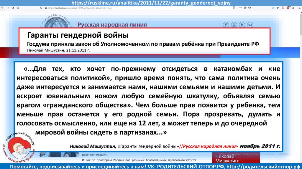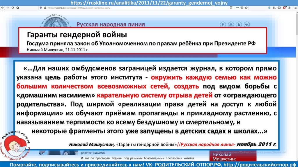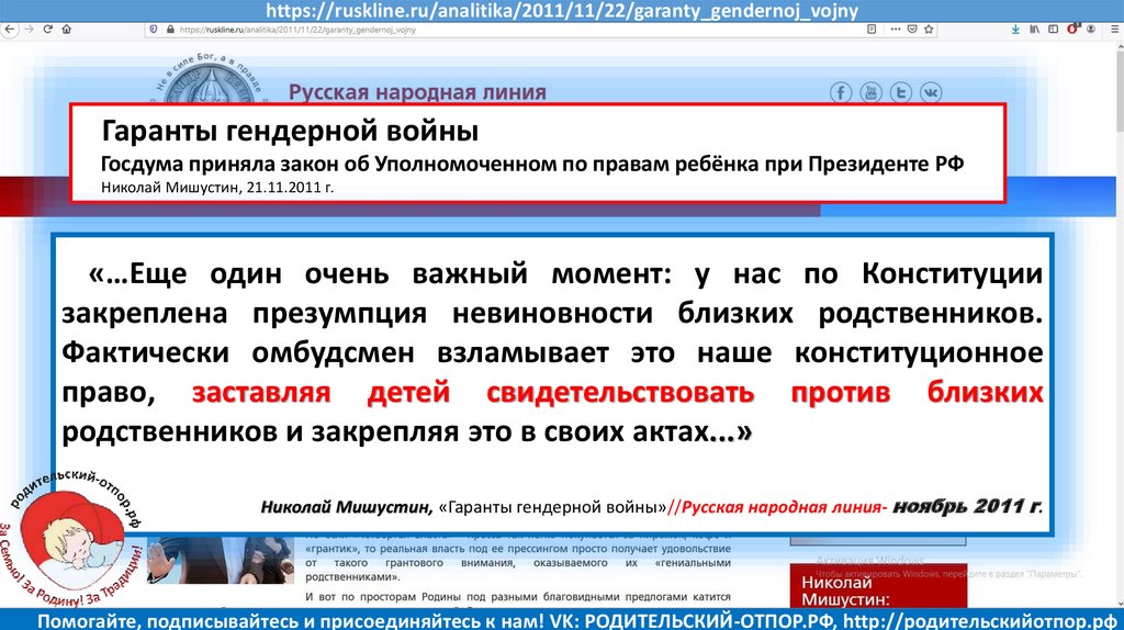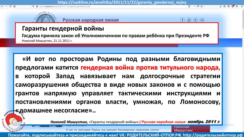 Николай Мишустин, «Гаранты гендерной войны»//Русская народная линия- ноябрь 2011 г.