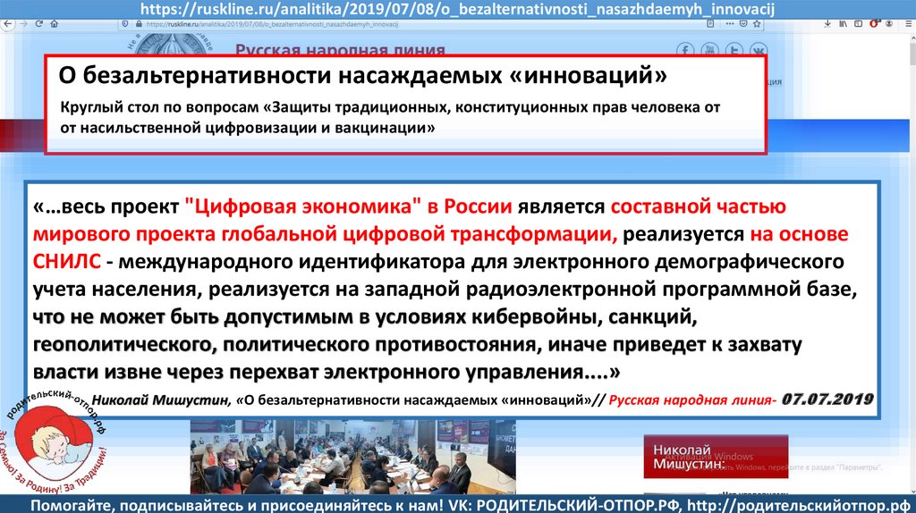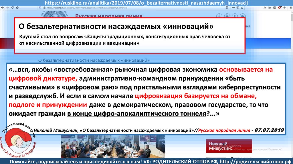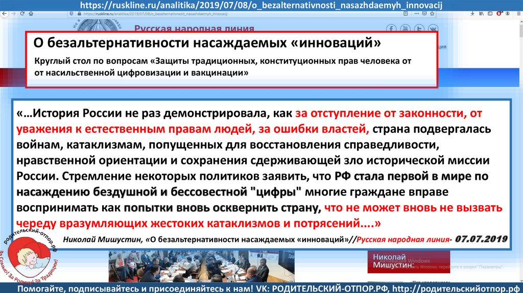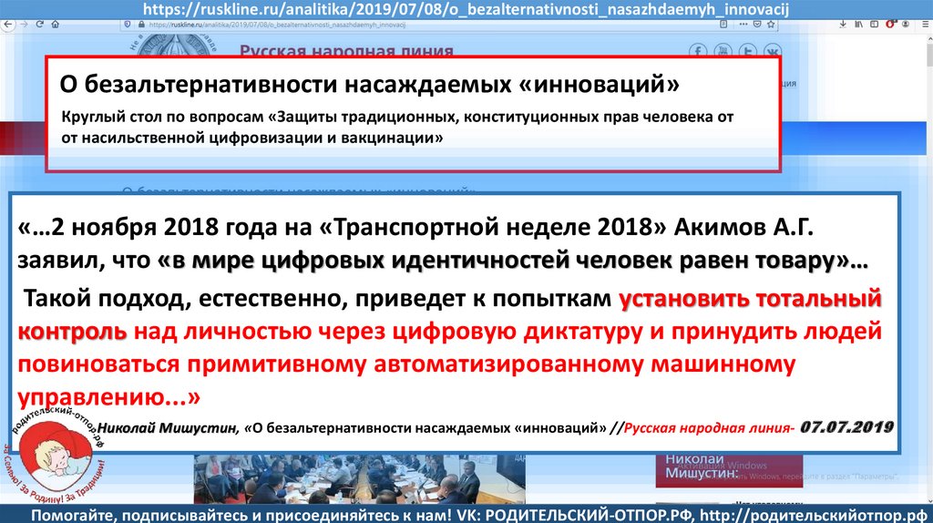 Николай Мишустин, «О безальтернативности насаждаемых «инноваций»//Русская народная линия- 07.07.2019