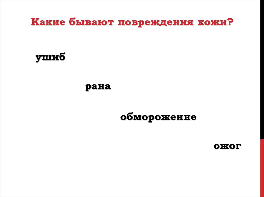 Кожа защищает организм от ушибов, ран, царапин, грязи,