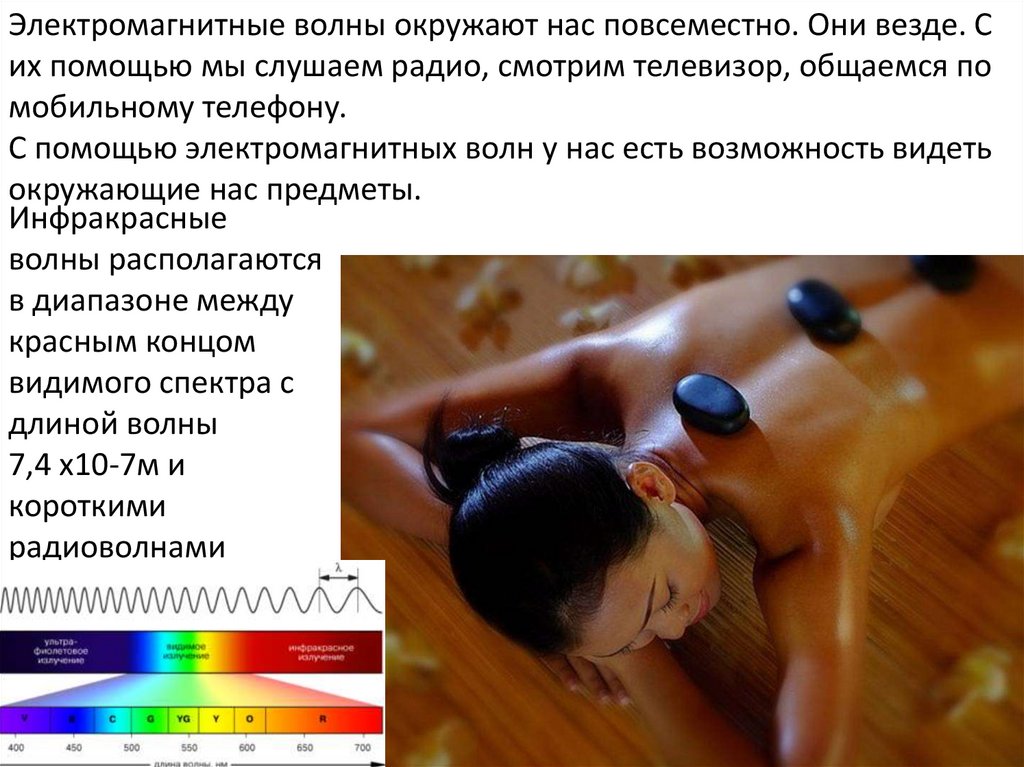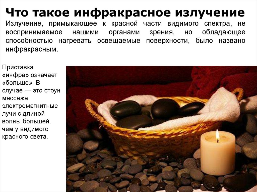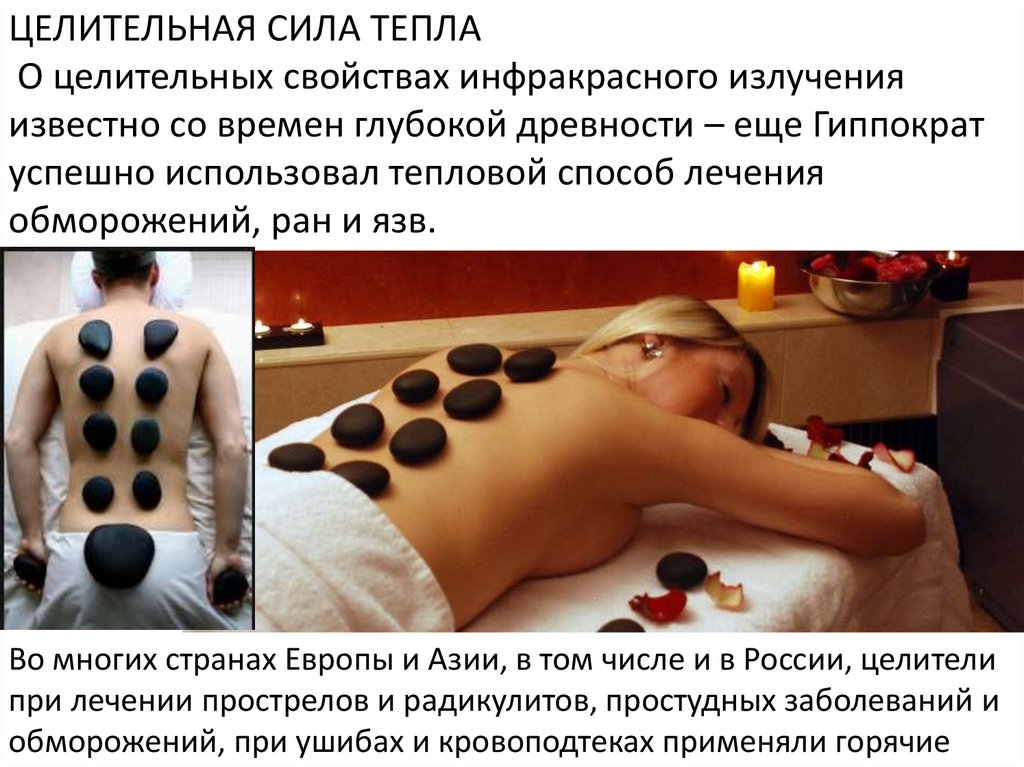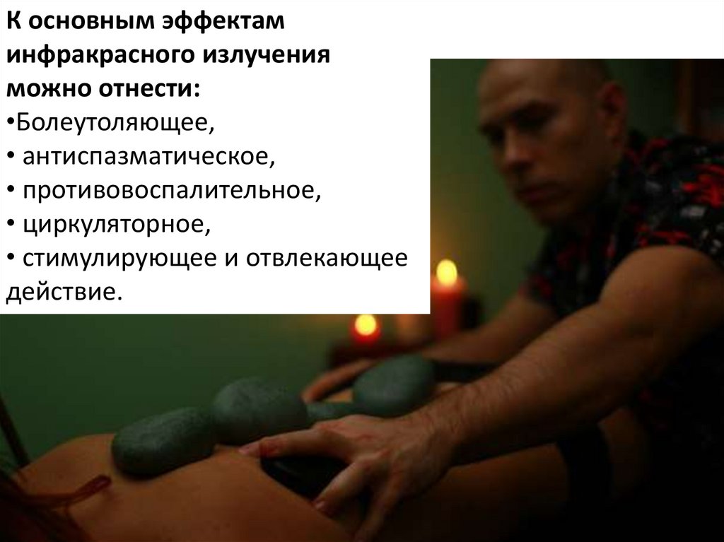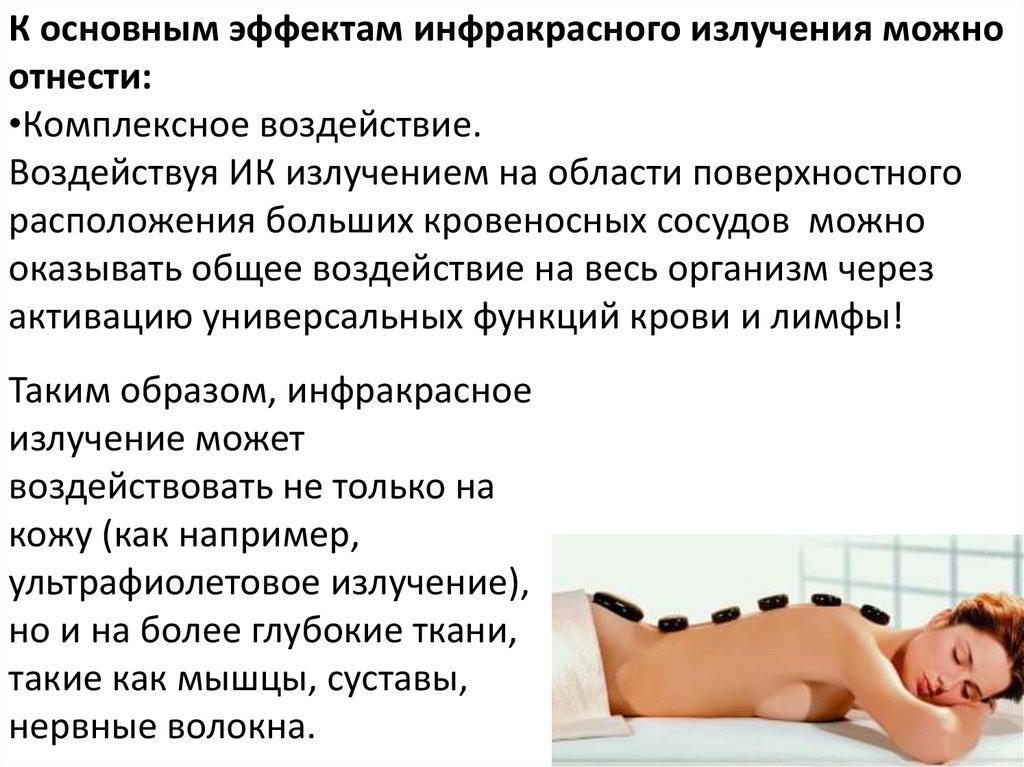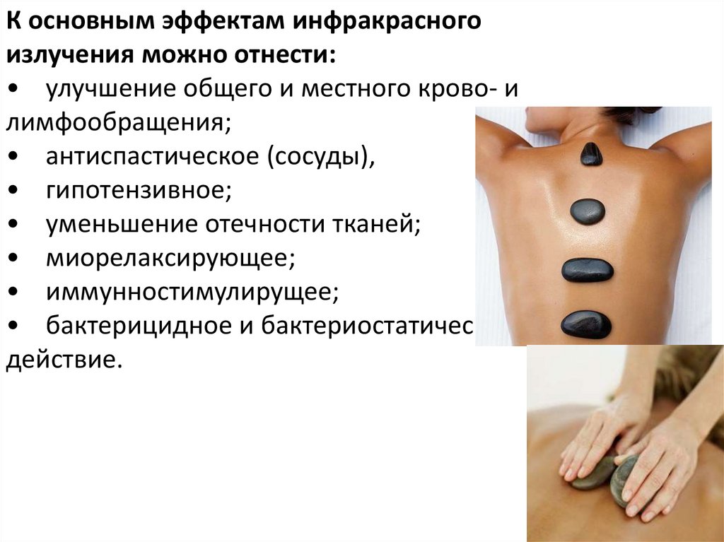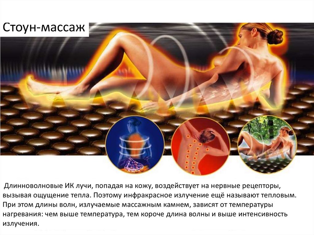 Стоун-массажДлинноволновые ИК лучи, попадая на кожу, воздействует на нервные рецепторы,