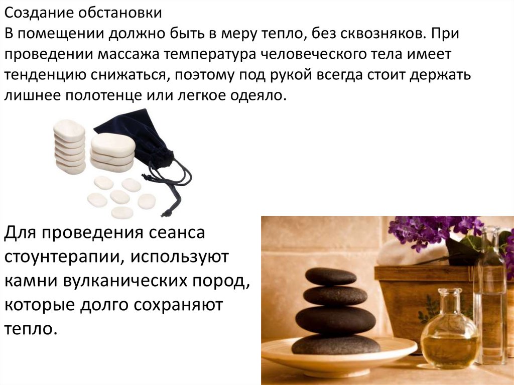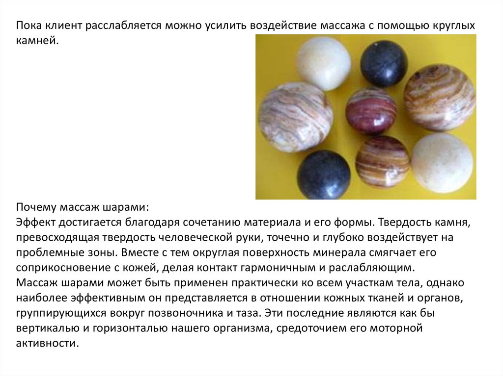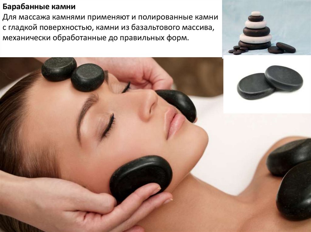 Пока клиент расслабляется можно усилить воздействие массажа с помощью круглыхкамней.