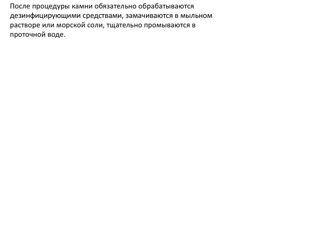 Рекомендуемая температура нагретых камней для проведенияпроцедуры не менее 45 и не более 55 градусов Цельсия.