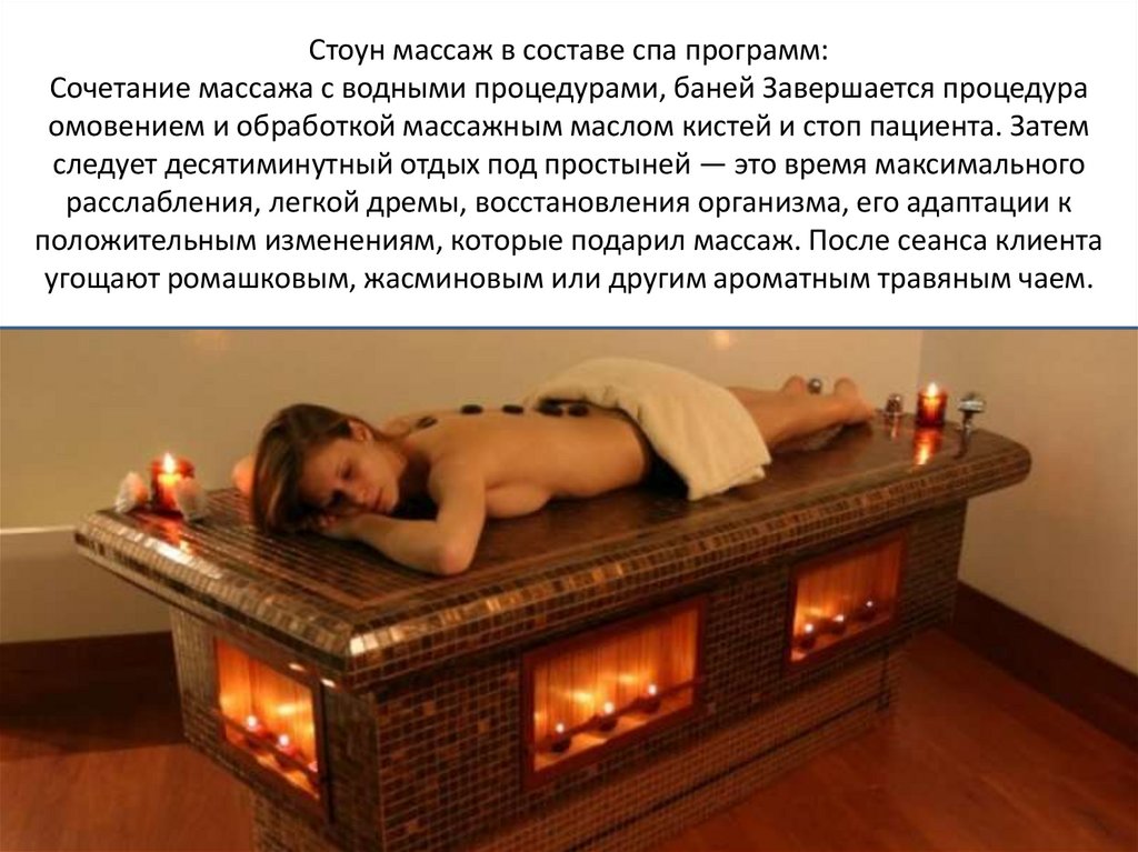 Стоун массаж в составе спа программ:Сочетание массажа с водными процедурами, баней Завершается процедура