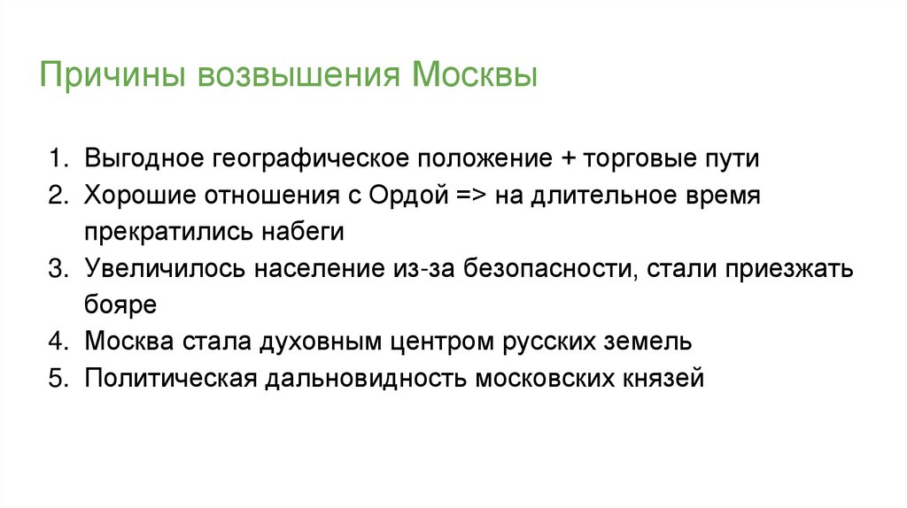 Причины возвышения Москвы1. Выгодное географическое положение + торговые пути