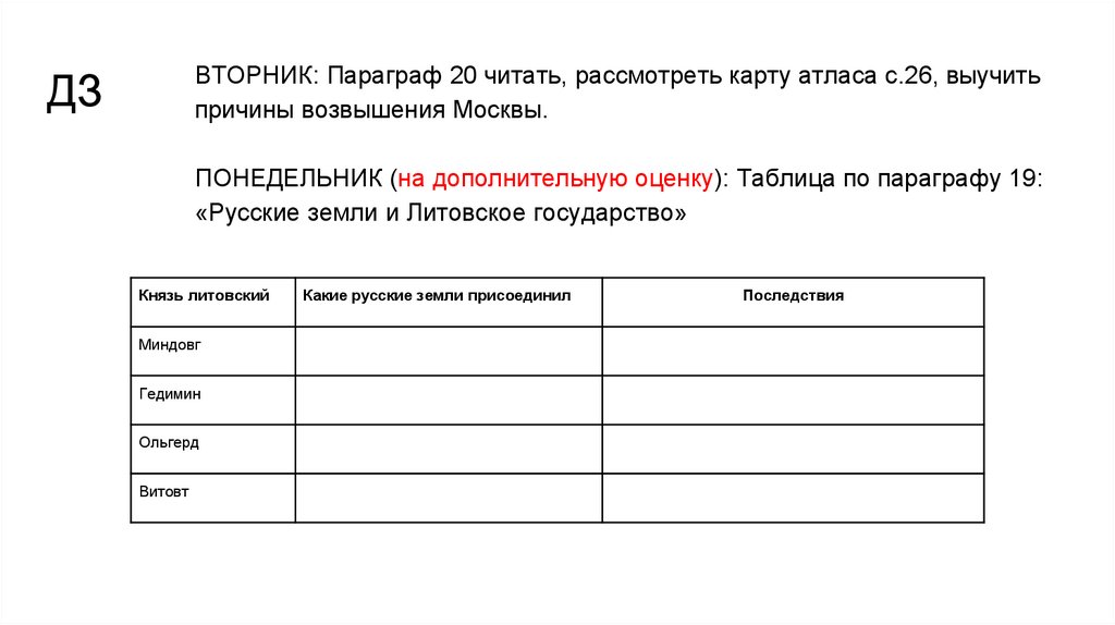 ВТОРНИК: Параграф 20 читать, рассмотреть карту атласа с.26, выучитьпричины возвышения Москвы.