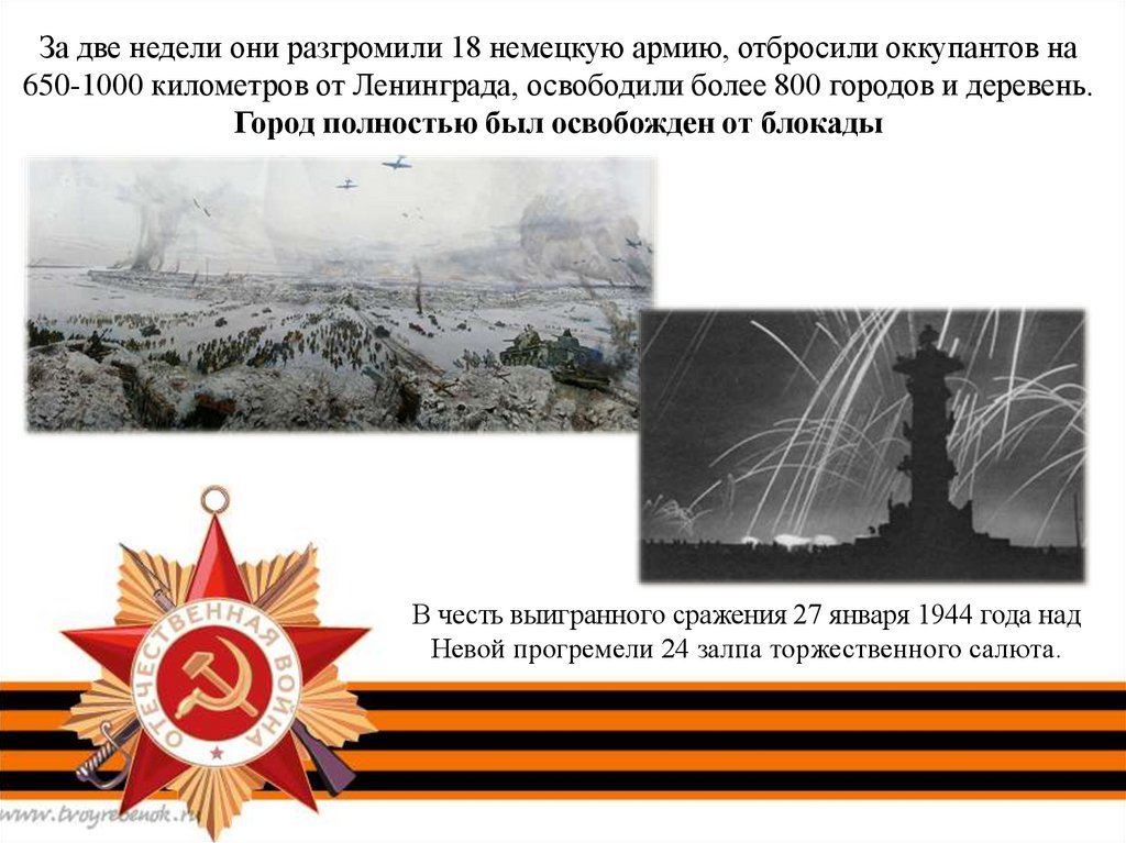 За две недели они разгромили 18 немецкую армию, отбросили оккупантов на650-1000 километров от Ленинграда, освободили более 800 городов и деревень.