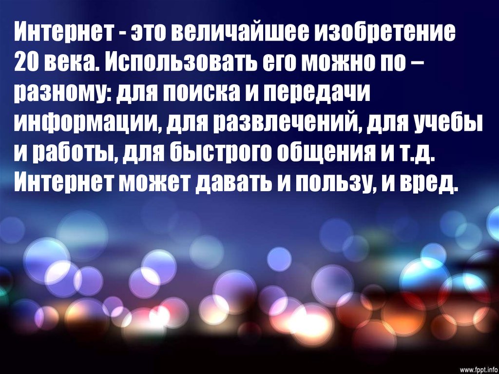 Интернет - это величайшее изобретение20 века. Использовать его можно по –
