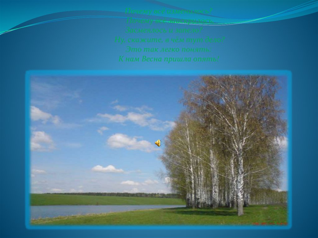 – весна!4. Взгляните, как стало красиво вокруг! Уже зеленеют деревья и луг. Пришла к нам веселая гостья - весна, И все пробудилось от