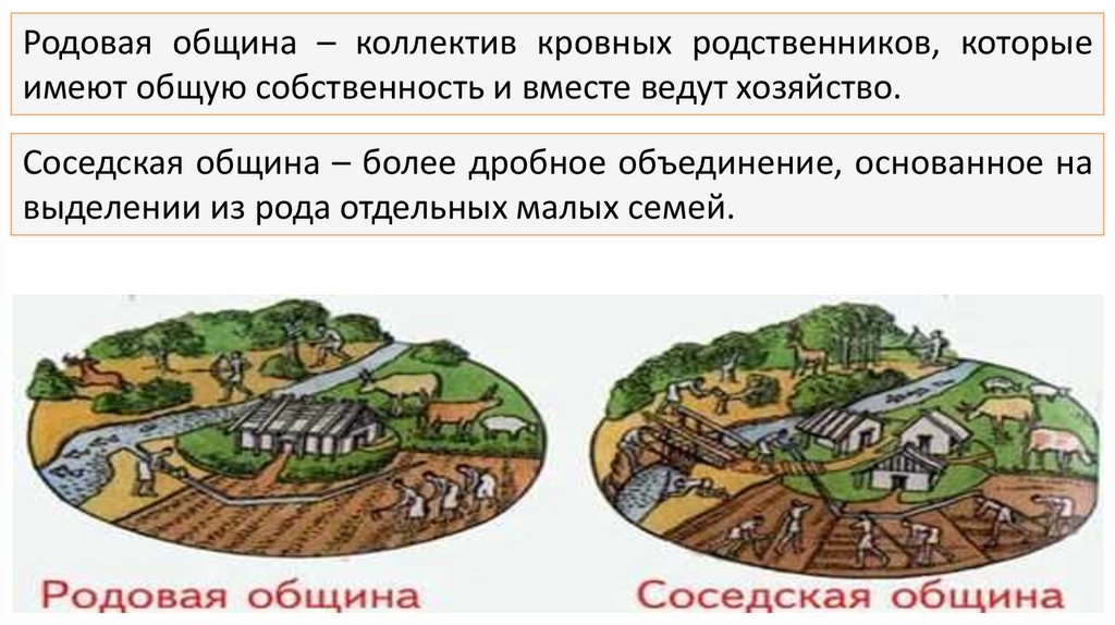 Родовая община – коллектив кровных родственников, которыеимеют общую собственность и вместе ведут хозяйство.