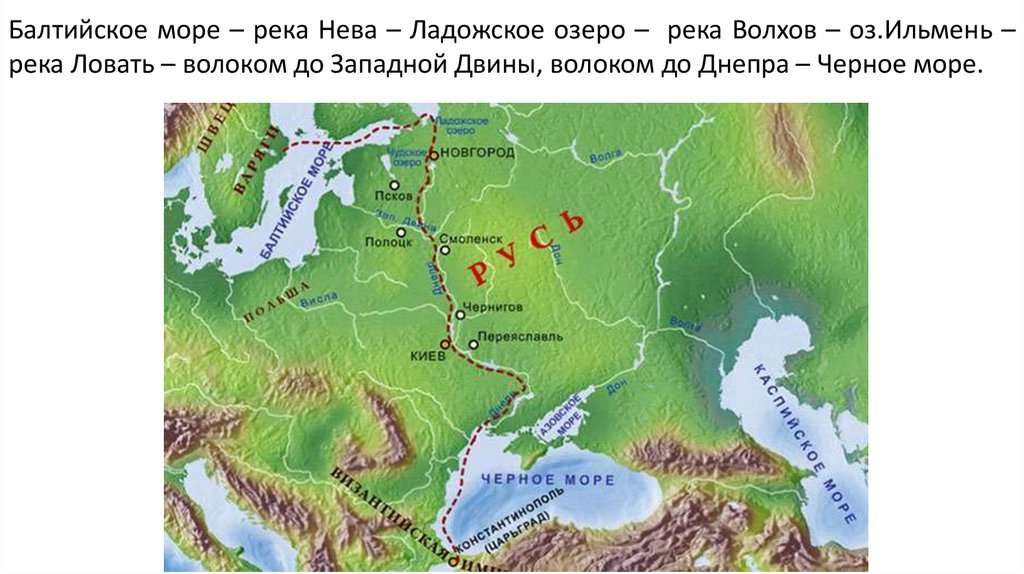 река Ловать – волоком до Западной Двины, волоком до Днепра – Черное море.