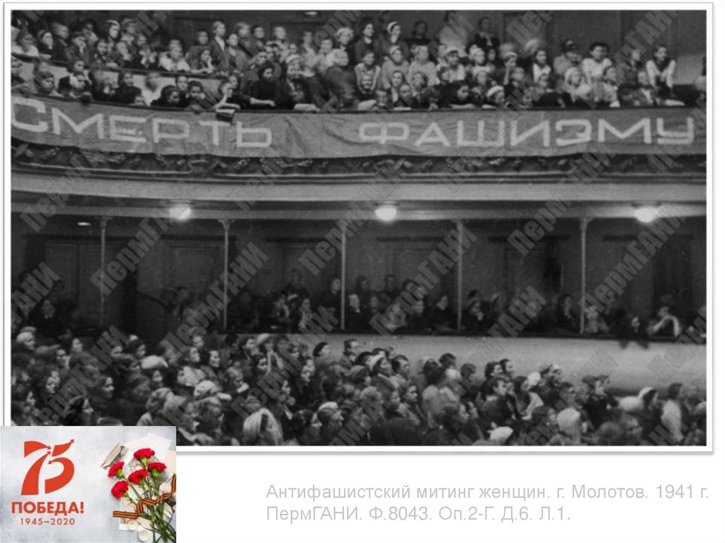 Антифашистский митинг женщин. г. Молотов. 1941 г.ПермГАНИ. Ф.8043. Оп.2-Г. Д.6. Л.1.