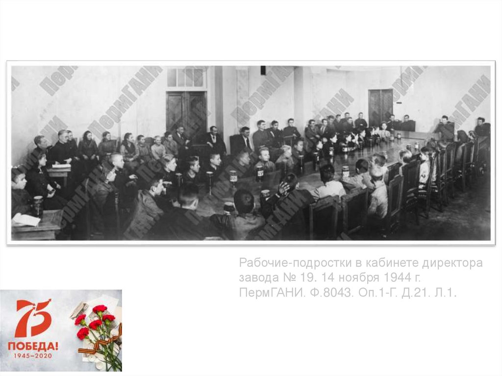Рабочие-подростки в кабинете директоразавода № 19. 14 ноября 1944 г.