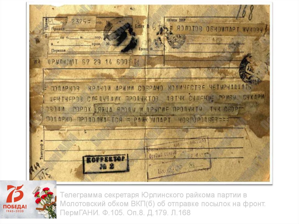 Телеграмма секретаря Юрлинского райкома партии вМолотовский обком ВКП(б) об отправке посылок на фронт.