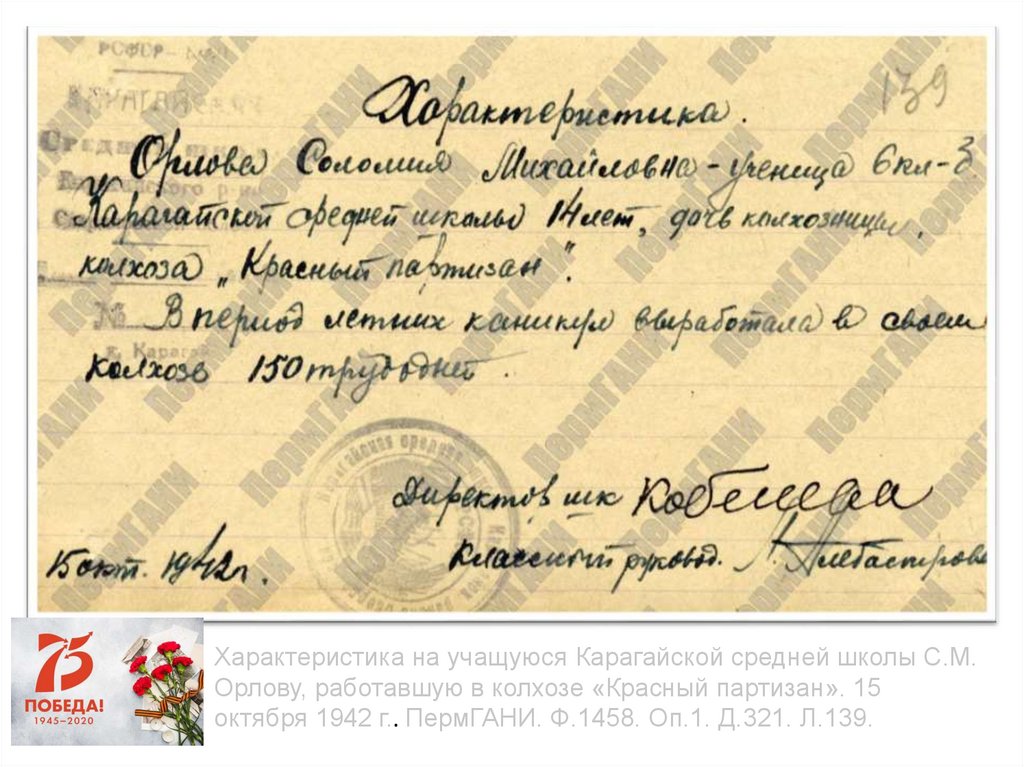 Характеристика на учащуюся Карагайской средней школы С.М.Орлову, работавшую в колхозе «Красный партизан». 15