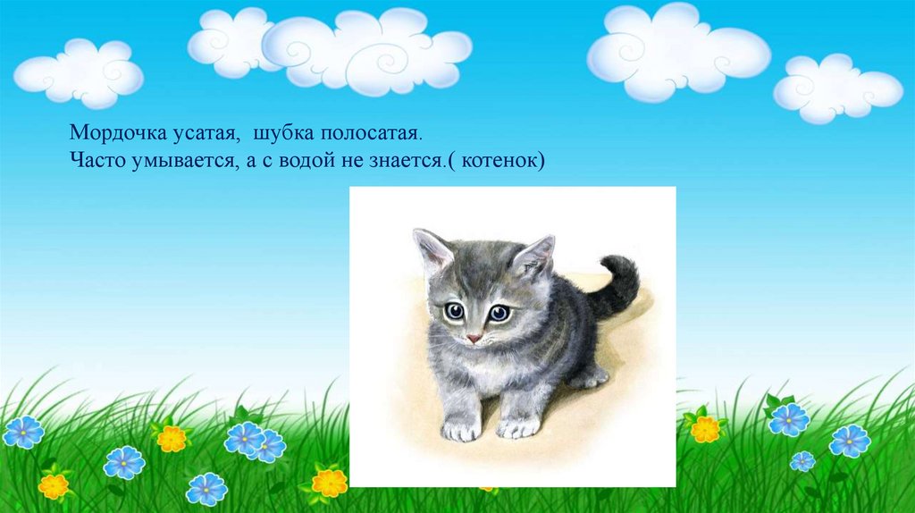 Мордочка усатая, шубка полосатая.Часто умывается, а с водой не знается.( котенок)