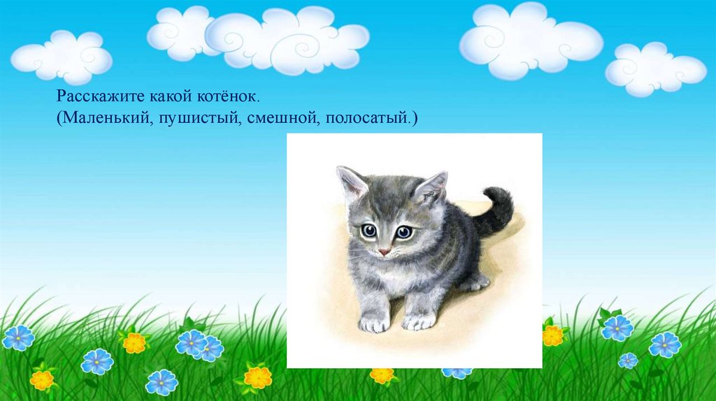 Расскажите какой котёнок.(Маленький, пушистый, смешной, полосатый.)