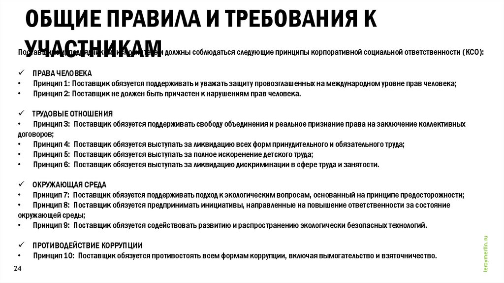 • Принцип 10: Поставщик обязуется противостоять всем формам коррупции, включая вымогательство и взяточничество.