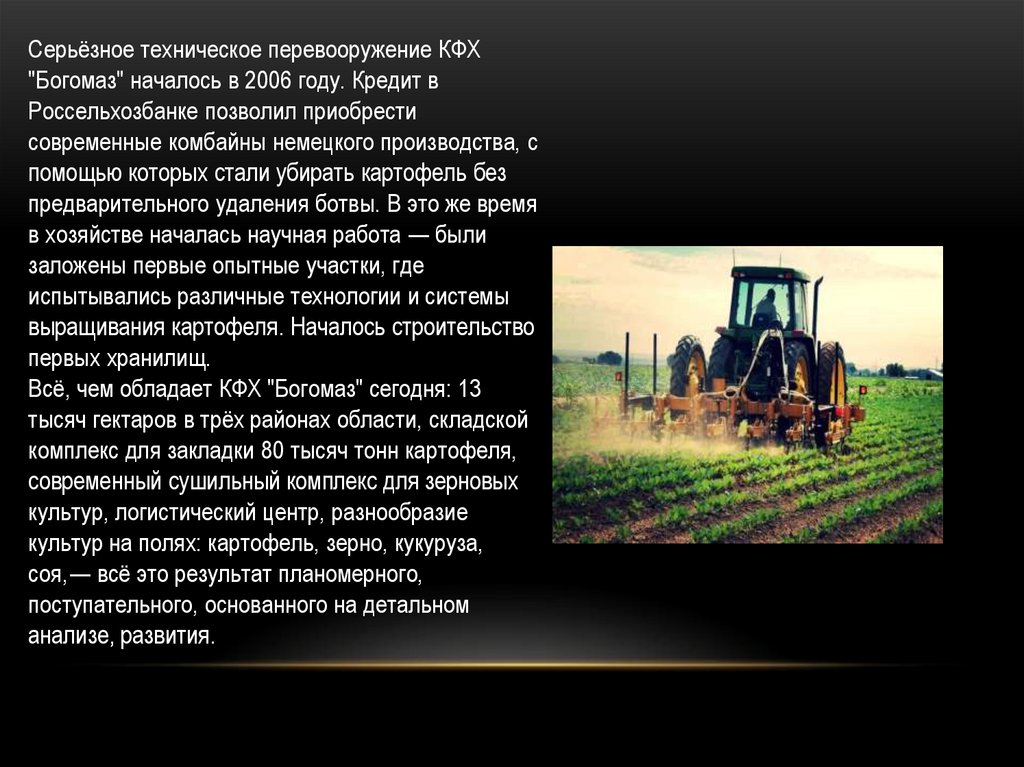 Серьёзное техническое перевооружение КФХ"Богомаз" началось в 2006 году. Кредит в
