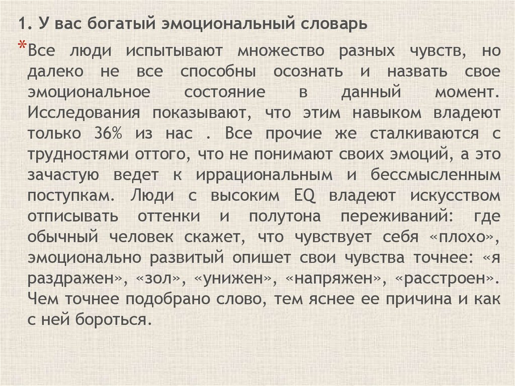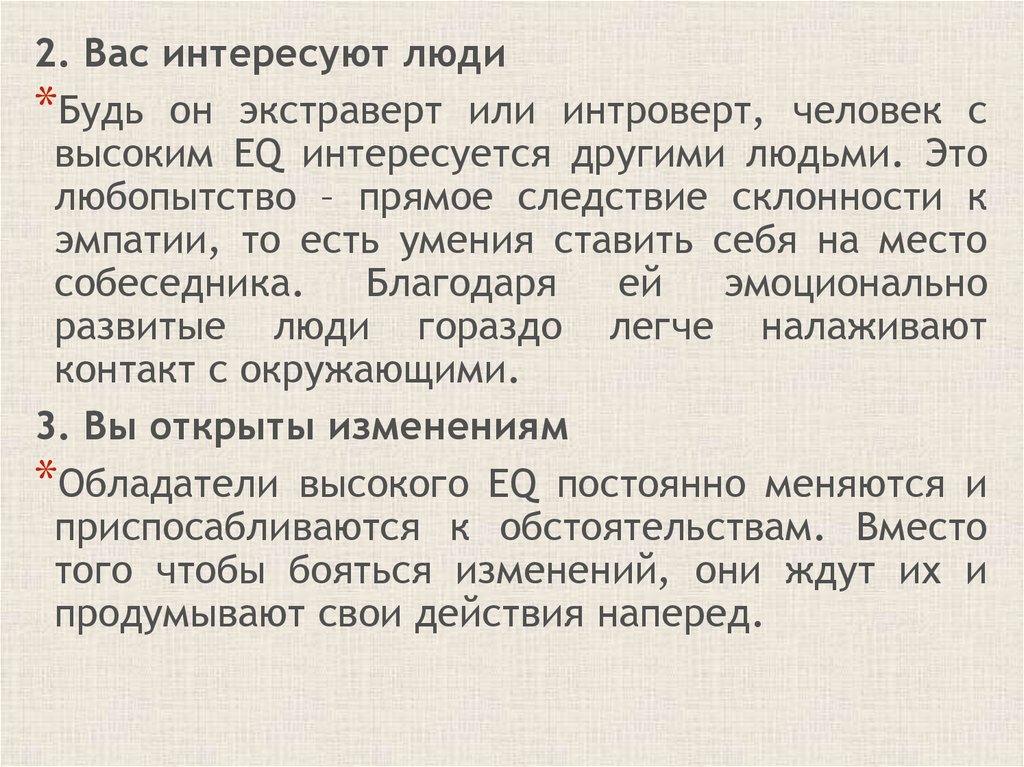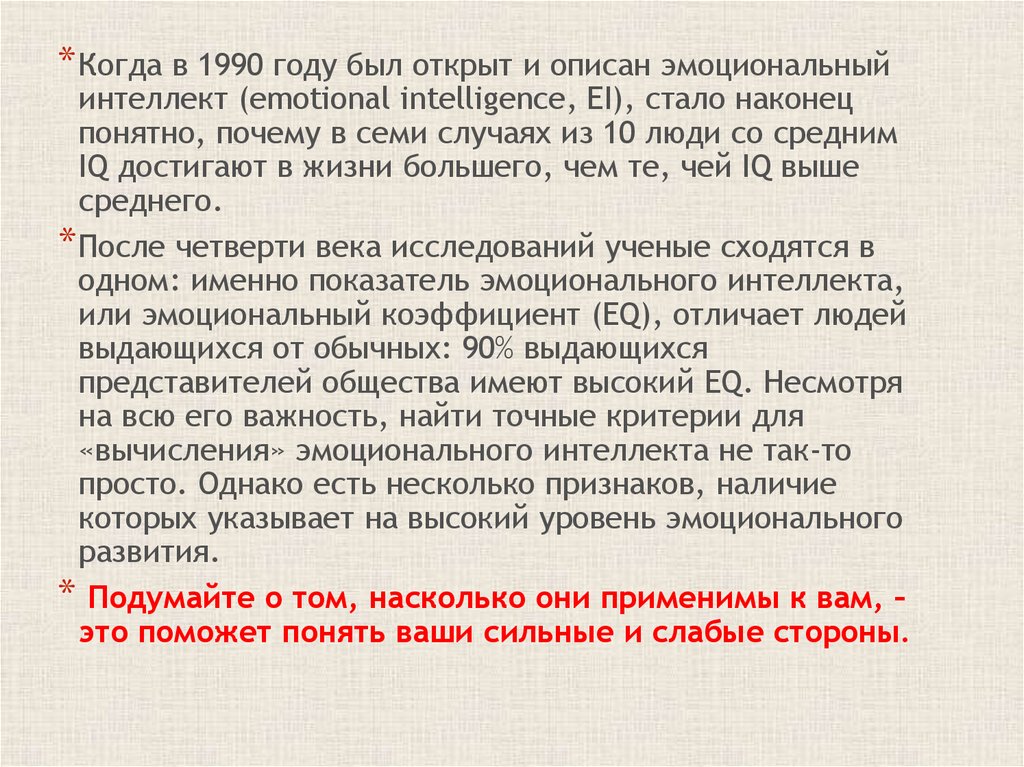 * Когда в 1990 году был открыт и описан эмоциональныйинтеллект (emotional intelligence, EI), стало наконец
