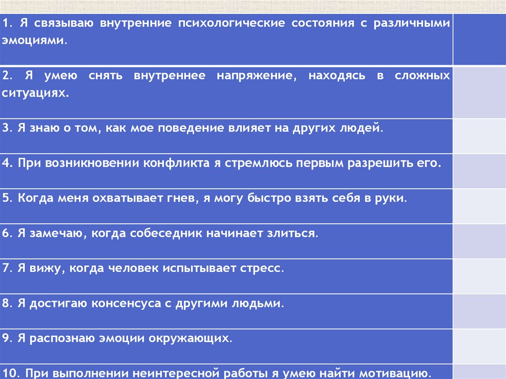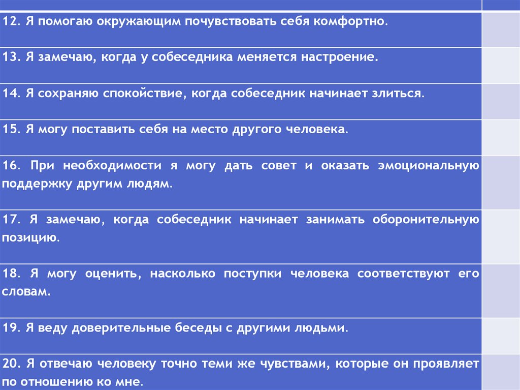 12. Я помогаю окружающим почувствовать себя комфортно.13. Я замечаю, когда у собеседника меняется настроение.