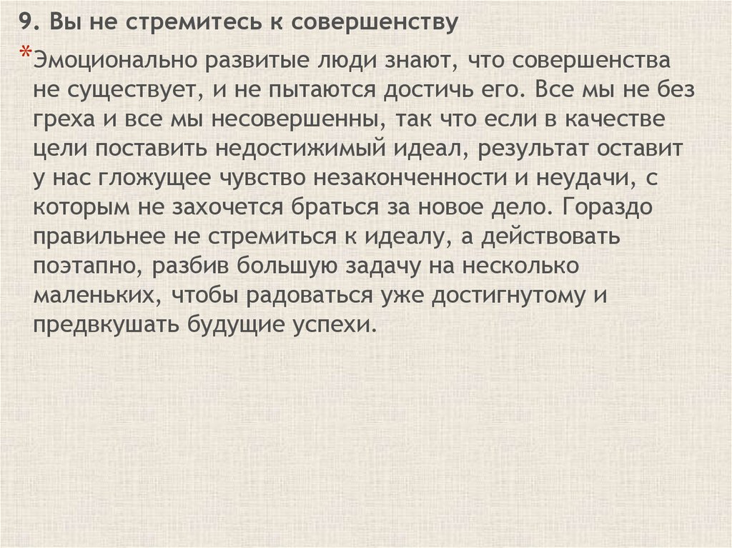 9. Вы не стремитесь к совершенству*Эмоционально развитые люди знают, что совершенства