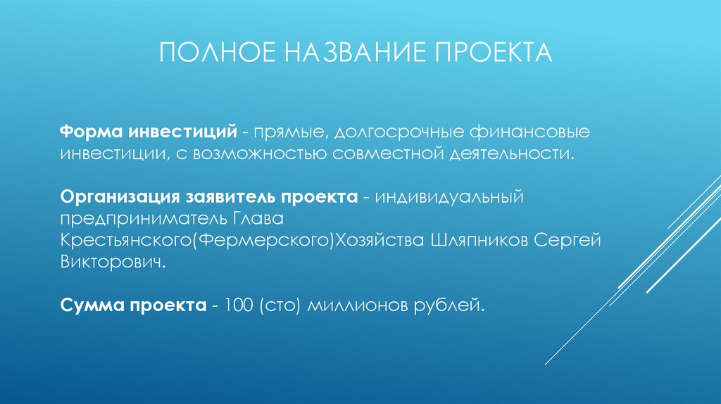ПОЛНОЕ НАЗВАНИЕ ПРОЕКТАФорма инвестиций - прямые, долгосрочные финансовые