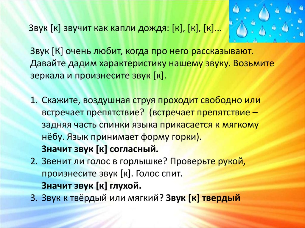 Звук [к] звучит как капли дождя: [к], [к], [к]...Звук [К] очень любит, когда про него рассказывают.