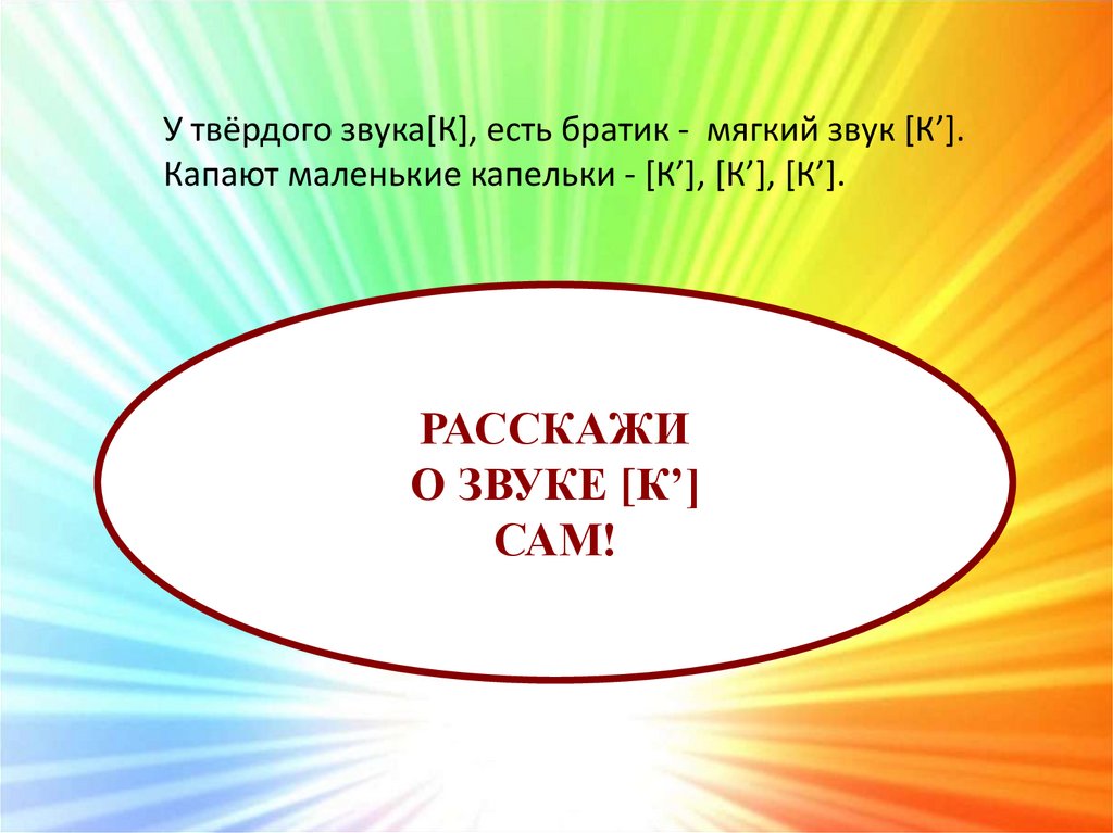 У твёрдого звука[К], есть братик - мягкий звук [К’].Капают маленькие капельки - [К’], [К’], [К’].
