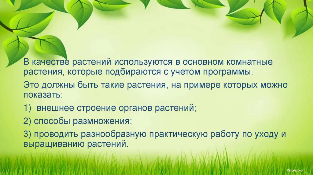 В качестве растений используются в основном комнатныерастения, которые подбираются с учетом программы.