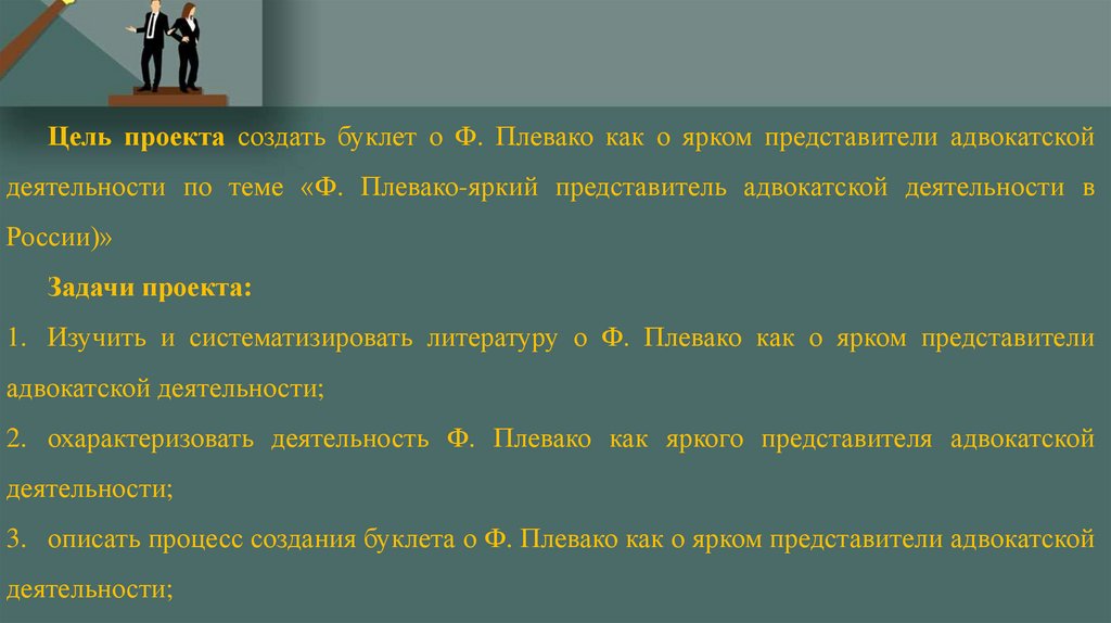 Цель проекта создать буклет о Ф. Плевако как о ярком представители адвокатскойдеятельности по теме «Ф. Плевако-яркий представитель адвокатской деятельности в