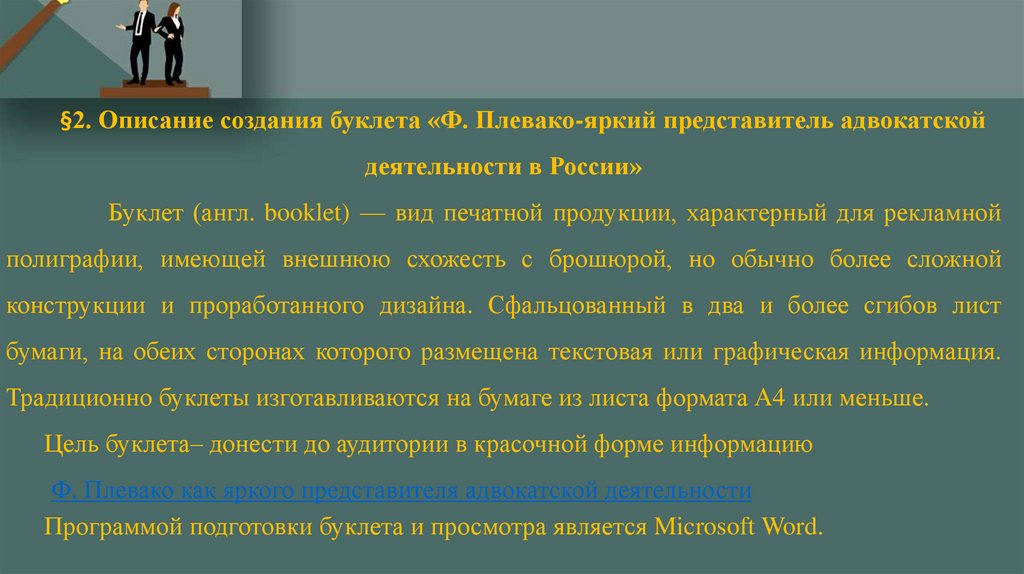 §2. Описание создания буклета «Ф. Плевако-яркий представитель адвокатскойдеятельности в России»
