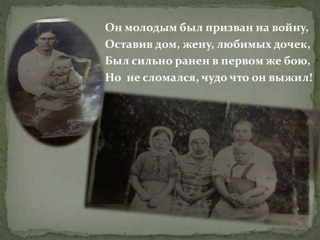 Он молодым был призван на войну,Оставив дом, жену, любимых дочек,