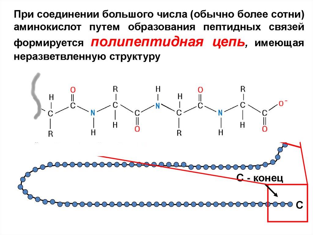При соединении большого числа (обычно более сотни)аминокислот путем образования пептидных связей