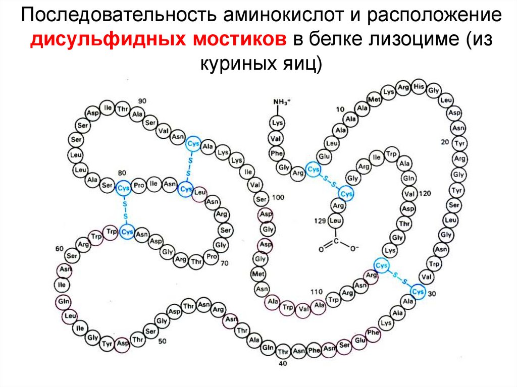 Последовательность аминокислот и расположениедисульфидных мостиков в белке лизоциме (из