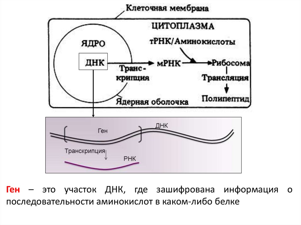Ген – это участок ДНК, где зашифрована информация опоследовательности аминокислот в каком-либо белке