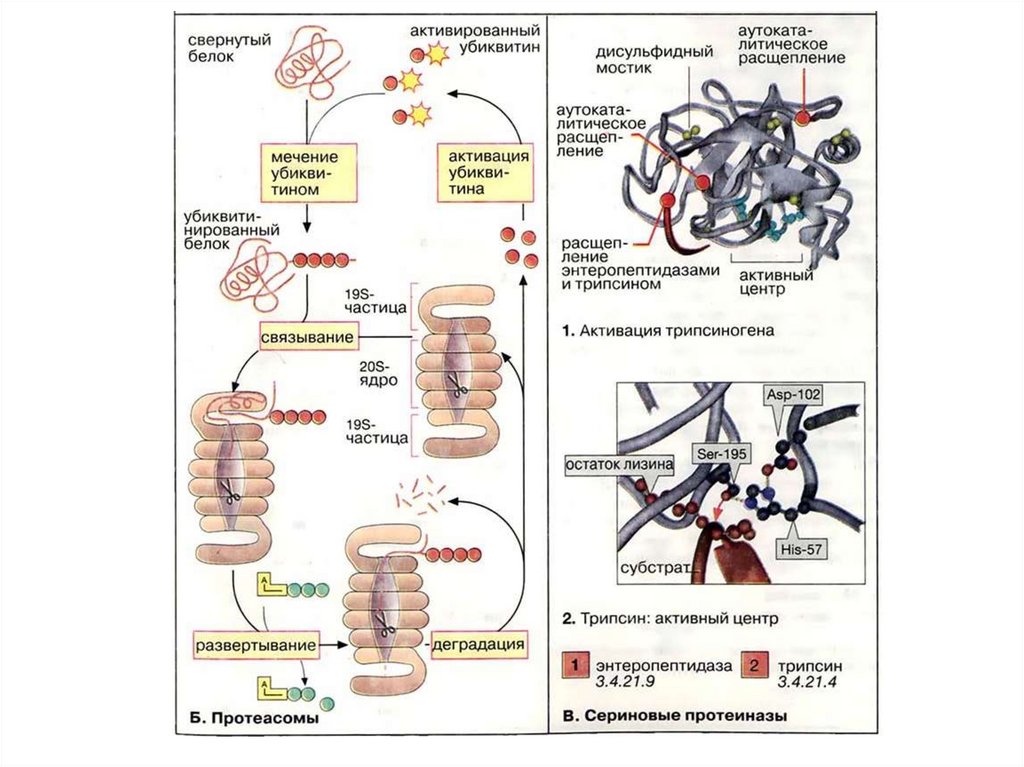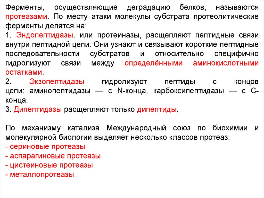 Ферменты, осуществляющие деградацию белков, называютсяпротеазами. По месту атаки молекулы субстрата протеолитические