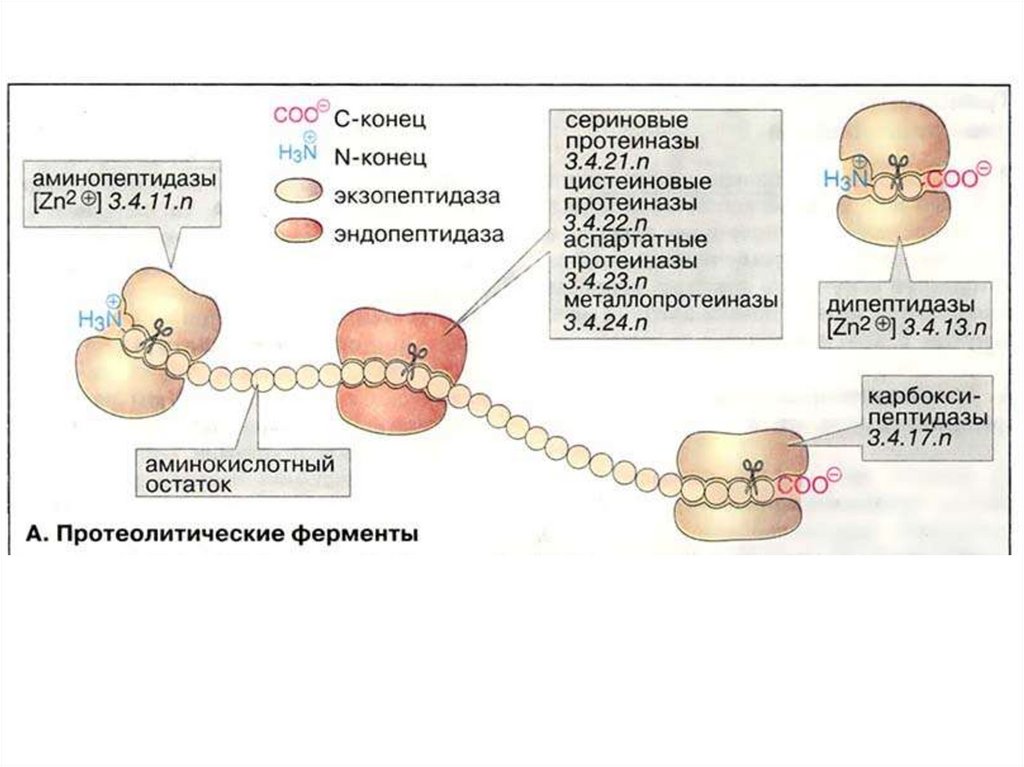 1. Эндопептидазы, или протеиназы, расщепляют пептидные связи